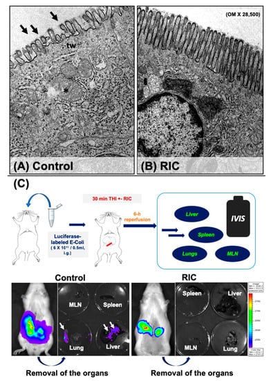 These structural observation correlated well with the observed damage of the functional barrier. Following the administration of bioluminescence E. coli, significant extra-intestinal accumulation was observed in the animals of the Control group, while no relevant luciferase activity was detected by the IVIS system in the animals of the RIC group, suggesting an active reduction of bacterial translocation by iRIC. Only very limited data is available to date on the effects of iRIC on barrier integrity and bacterial translocation following liver IRI (Table 1). In our previous report by Kageyama et al., we could show a reduced mucosal damage in the second window of protection following iRIC assessed by the Park score on conventional histological samples []. This was associated with an increased expression of hemoxygenase-1 (HO-1) in the intestinal mucosa and in the liver, suggesting a potential mechanistic role of HO-1 behind the effects of late iRIC [].