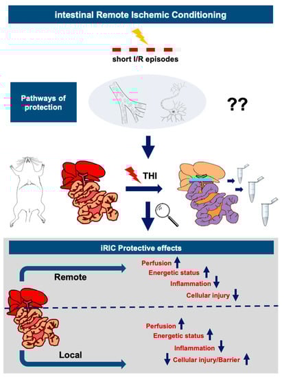 Due to this above-described dual injury (liver IRI and splanchnic congestion) induced by THI, we hypothesized that iRIC might confer a protection via local conditioning effects on the small intestine, protecting against the dramatic consequences of the loss of barrier function and bacterial translocation as well as by mitigating hepatic IRI, targeting the liver as a remote organ.