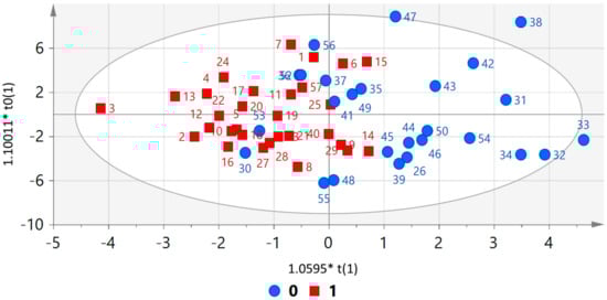 Score plot from orthogonal and partial least squares discriminant analysis (OPLS-DA) of case (1) and control (0) individuals. Input variables are metabolomic data. R2Y = 0.42, Q2 = 0.16. unit variance scaling. Permutation R2 = 0.217, Q2 = −0.333. cross-validated -ANOVA: 0.066.