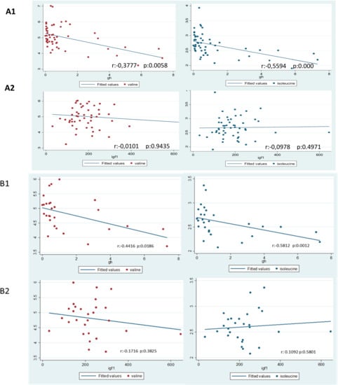 Results regarding the Spearman correlation between BCAAs and either GH or IGF-1 are displayed in Figure 2. Serum levels of GH were negatively correlated with both valine (r = −0.38, p < 0.01) and isoleucine (r = −0.56, p < 0.001) both in the whole population and in the ACRO group: Valine (r = −0.44, p <0.02) and isoleucine (r = −0.58, p < 0.001). We did not find any correlation between IGF-1 or HOMA and BCAAs in either the whole population or in patients with ACRO.