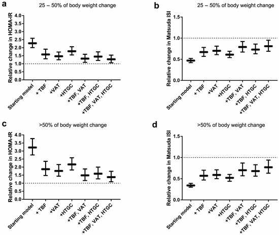 Relative changes (95% CI) of measures of HOMA-IR and Matsuda Index for participants who gained 25–50% of body weight (a,b) or >50% of body weight (c,d) after addition of mediators, compared to weight maintainers. TBF, total body fat; VAT, visceral adipose tissue; HTGC, hepatic triglyceride content. Starting model (model 3) was adjusted for sex, age, BMI at age 20, ethnicity, education, smoking, alcohol consumption, physical activity and family history of diabetes.