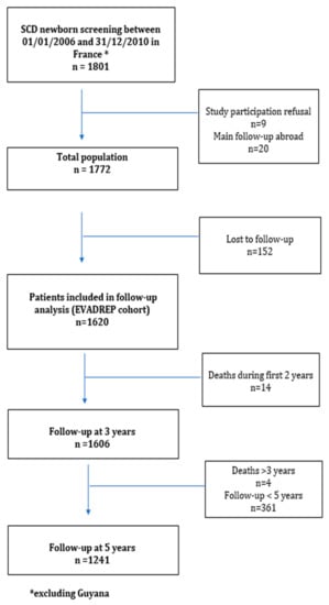 Between 01/01/2006 and 31/12/2010, 1801 consecutive newborns with SCD were identified by the National NBS program (Figure 1). Nine families declined participation and 20 patients did not reside in France (their follow-up was occasionally performed in France). Out of the 1772 remaining patients, 152 (8.5%) were lost to follow-up at the time of data collection (from January 2014 to December 2015), of whom 44 were known to have returned to their country of origin. Among the 152 children lost to follow-up, 43 (28.3%) were lost to follow up following NBS and 109 (71.7%) later on. Finally, a total of 1620 patients with available follow-up data during 2014/2015 or deceased before five years were thereafter analyzed and constituted the EVADREP cohort. Subsequently, at the time of data analysis, 100% of living patients in the cohort had reached at least three years of age while 77% had reached five years.