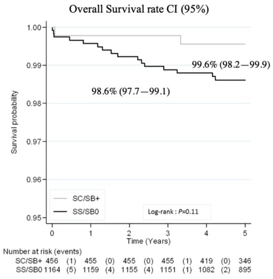 Probability of survival for all children at five years was 98.9% (95%CI: 98.2–99.3) and was 98.6% (97.7–99.1) and 99.6% (98.2–99.9) in SS/SB° and SC/SB+ patients, respectively (Figure 2).