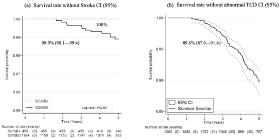 (a) Probability of survival without stroke; (b) probability of survival without abnormal transcranial Doppler (TCD) in children with SS/SB° disease.