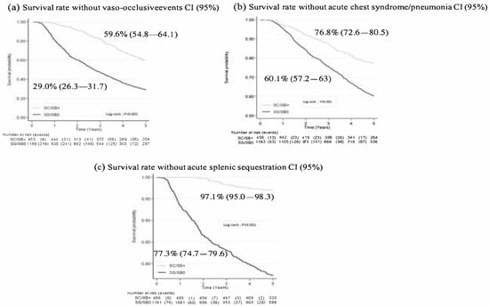 A total of 549 children developed at least one episode of either pneumonia or ACS or both leading to a five-years probability of survival without experiencing a first episode of pneumonia/ACS of 64.8% (62.4–67.2). This probability was significantly higher for patients with SC/SB+ genotype than for those with for SS/SB° (p < 0.001); see also Figure 4b.