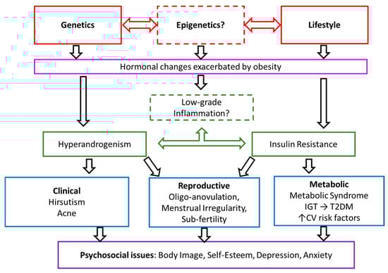 In addition, PCOS pathophysiology appears to have a polygenic predisposition that is exacerbated by environmental factors, especially obesity []. The polygenic predisposition is well documented with familial clustering of PCOS symptoms, providing evidence for a genetic contribution to the pathophysiology []. Both female and male family members of women diagnosed with PCOS share common characteristics of the syndrome. Moreover, they seem to be more prone to develop T2DM and metabolic syndrome []. Finally, mono- and dizygotic twin studies have demonstrated the heritability of PCOS to be approximately 70% [].
