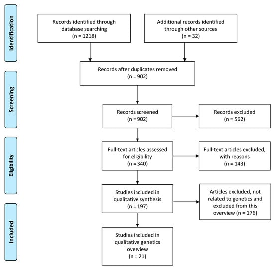 The search yielded 1218 publications and 902 remained after removal of duplicates. A further 32 studies were identified from PROSPERO. Based on a priori selection criteria, screening for title or abstract identified 340 studies for assessment of full text. Of these, 143 articles were excluded due to not conducting quality assessment, not being in English, or no search terms or search strategy identified. Detailed characteristics of excluded studies are reported in Table S3. Of the remaining 197 full-text systematic reviews, 21 were related to genetics and included in this OSR (Figure 2).