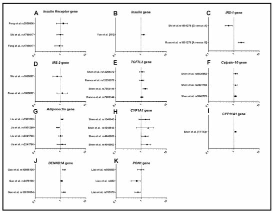 Forest plots representing the association between metabolic SNPs and PCOS under the allele model. (A) Insulin receptor; (B) Insulin gene variable number of tandem repeats (INS-VNTR); (C) Insulin Receptor Substrate-1 (IRS-1); (D) Insulin Receptor Substrate-2 (IRS-2); (E) Transcription Factor 7-Like 2 (TCF7L2); (F) Calpain-10; (G) Adiponectin; (H) Cytochrome P450 Family 1 Subfamily A Member 1 (CYP1A1); (I) Cytochrome P450 Family 11 Subfamily A Member 1 (CYP11A1); (J) DENN domain containing 1A (DENND1A); (K) Paraoxonase 1 (PON1). The circle represents the odds ratio (OR) and the horizontal lines are the 95% confidence intervals (CI).