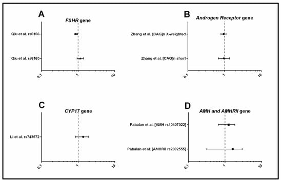 Four systematic reviews focused on CYP17, FSHR, AMH, AMH receptor (AMHR II), and androgen receptor (AR) genes and their association with androgens and gonadotrophins (Figure 4). The rs6166 SNP in FSHR was associated with PCOS with the Asn allele showing a protective effect for PCOS, but this was only significant in a mixed population of women with European ancestry []. CAG repeat length polymorphism in AR was positively associated with plasma testosterone concentration, but not with PCOS per se []. There were no clear association between SNPs in CYP17, AMH or AMHR with PCOS [,], however, it may be possible that other SNPs within these gene loci are related to PCOS and/or specific clinical characteristics of PCOS []. In summary, SNPs in the genes FSHR and AR were found to be associated with risk of PCOS.