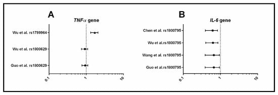 Forest plots representing the association between metabolic SNPs and PCOS under the allele model. (A) TNF-α, Tumor Necrosis Factor-Alpha; (B) IL, Interleukin. The circle represents the odds ratio (OR) and the horizontal lines are the 95% confidence intervals (CI).