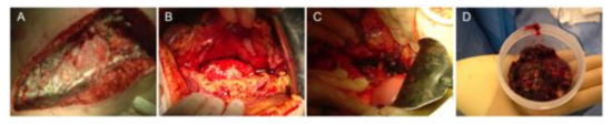Open necrosectomy (sequential steps). (A) Transverse laparotomy, (B) retrogastric approach, (C) major artery skeletonized, and (D) necrosectomy specimen.