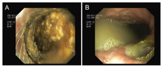 Transmural route. (A) Necrosectomy through the prosthesis and (B) purulent drainage to the gastric lumen.