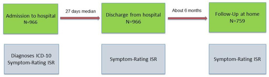 We performed an observational study to evaluate the effect of multimodal treatment on the symptom loads of patients with chronic psychosomatic disorders. The study was performed according to the STROBE guidelines, which is a checklist providing guidance for appropriately reporting observational research [24,25]. At admission, all inpatients were diagnosed according to the western routine and diseases were coded according to ICD-10. Psychological disorders at admission and discharge from the TCM Hospital as well as follow-up were symptomatically evaluated by the valid, standardized, and patient-reported questionnaire ISR (ICD-10 symptom rating) (Figure 1). The timeframe of admission was between 21 January and 29 December 2017. Timeframe of discharge was between the 20 January 2017 and the 30 January 2018. Timeframe of follow-up was between 17 July 2017 and the 30 August 2018.