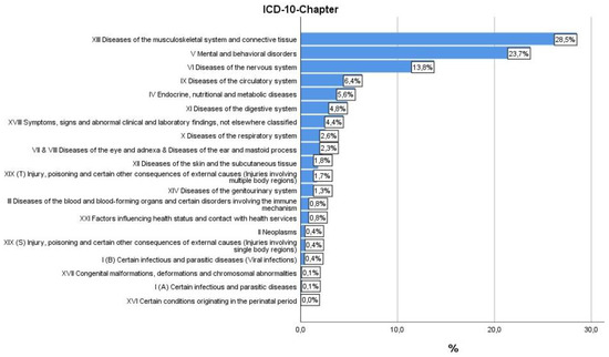 Within the sample of 966 patients, the most frequent ICD-10 diagnoses were “Diseases of the musculoskeletal system and connective tissue” (28.5%), “Mental and behavioral disorders” (23.7%), and “Diseases of the nervous system” (13.8%) (Figure 2).