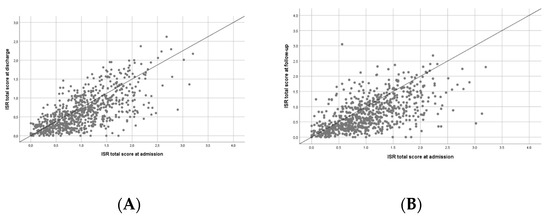 3.2. Symptom Load (ISR Total Score and Subscores) at Admission, Discharge, and Follow-Up