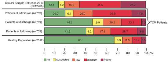 We classified the symptom loads of our collective of 759 patients with complete data sets (admission, discharge, and follow-up) at admission into the five categories “no”, “suspected”, “low”, “medium”, and “heavy” and compared the loads with a clinical sample (n = 12,265) published by Tritt et al. [19]. We found similar distributions concerning the severity of symptom loads in both collectives (Figure 5, first two panels). In a second step, we analyzed the effect of multimodal intervention on severity of symptoms at admission, discharge, and follow-up (panels 2.3 and 4). At admission, only 20% of our patients had no symptoms according to ISR, at discharge about 44% and at follow-up 41% were symptom-free, after a median treatment duration of 27 days in the TCM Hospital (panels 2 and 3).