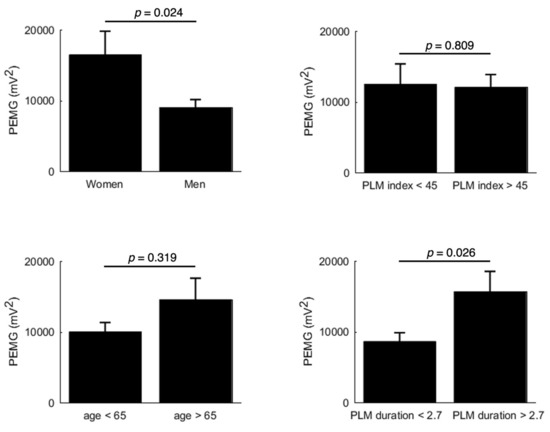 Figure 1 reports the power of EMG activity according to age, sex, PLMS index, and duration. As illustrated, the power of EMG activity differed significantly according to PLMS duration (p < 0.03) and gender (p < 0.03), without having an effect on the PLMS index (p = 0.81) and age (p = 0.32).