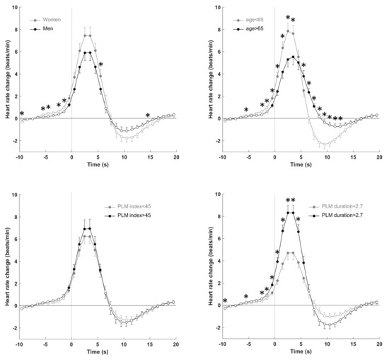 Heart rate response to leg movements during stage 2 according to sex, age, PLMS index, and PLMS duration. Data are presented as means ± SEM. The dashed line represents the leg movement onset. * p < 0.05 between sex, age, PLM index and PLMS duration. Filled circles indicate p < 0.05 from baseline.