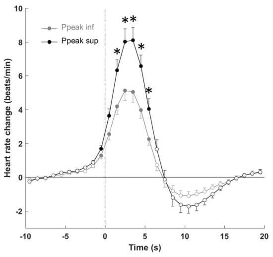Heart rate response to leg movements measured during stage 2 depending on electromyogram (EMG) power. Ppeak sup and Ppeak inf are the responses for subjects presenting a Ppeak value higher and lower than the median value, respectively. Data are presented as means ± SEM. The dashed line represents leg movement onset. * p < 0.05 between Ppeak inf and Ppeak sup. Filled circles indicate p < 0.05 from baseline.