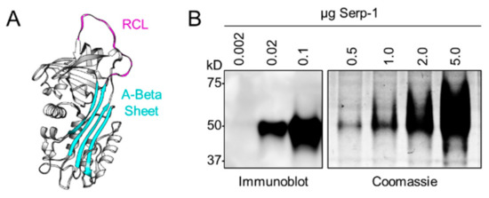 Myxoma virus-derived immune modulating serine protease inhibitor, Serp-1. (A) Structure of Serp-1 depicting a classic serpin structure with reactive center loop (RCL; magenta) and A-Beta sheet (cyan) indicated. (B) Immunoblot (left) and Coomassie (right) validation of purified recombinant cGMP Serp-1 using an anti-Serp-1 mouse monoclonal antibody.