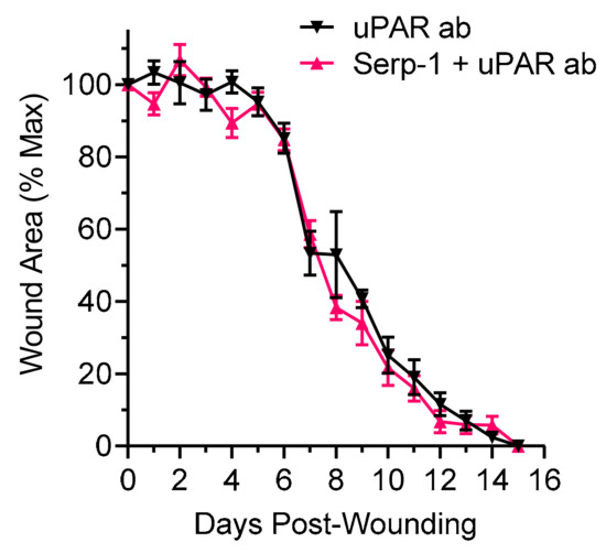 In prior work, thrombolytic protease urokinase-type plasminogen activator (uPA) and the uPA receptor (uPAR) were identified as key molecular targets for Serp-1. Serp-1 anti-inflammatory activity is lost in uPAR-deficient aortic allograft transplants [40,46]. We assessed whether Serp-1 therapeutic efficacy in wound healing was uPAR-dependent by antibody neutralization of uPAR in the wound bed. On the day of wounding and on day three post-wounding, uPAR antibody (uPAR ab) was applied to the wound area immediately prior to Serp-1 application. Neutralization of uPAR in the wound bed completely abolished Serp-1 therapeutic benefit as measured by planimetry, demonstrating that Serp-1 functions in an uPAR-dependent manner to promote wound healing (Figure 3; p = 0.8710).