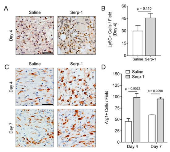 We next measured the presence of M2-polarized anti-inflammatory macrophage cell counts during wound-healing by IHC with antibodies against Arginase-1 (Arg-1), a prototypic M2 marker in mice (Figure 4C) [65,66]. M2 macrophages promote a pro-resolution stage in wound healing [67]. Arg-1 positive macrophages were significantly increased at days four and seven in wounds treated with Serp-1 versus wounds treated with saline (Figure 4D; p = 0.0022 at day four and p = 0.0098 at day seven). Thus, Serp-1 promotes an anti-inflammatory environment in full thickness wounds with minimal effects on neutrophil responses.