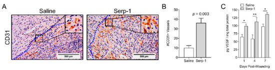 We next examined new vessel growth (vascularization) at seven days post-wounding—an intermediate time during which wounds were observed to begin healing at a rapid rate (Figure 2C). We analyzed vascularization by immunohistochemistry with antibodies against the endothelial marker CD31 (also called PECAM-1), a marker for endothelial cells commonly used to indicate wound bed blood vessels [68]. The number of positive staining vessels in different optical fields was quantified from four pairs of saline- and Serp-1-treated wounds. We first noted that Serp-1-treated mice had appreciably more CD31-positive vessels, with increased length and thickness, versus mice treated with saline alone (Figure 5A). Quantitatively, vessel density was significantly increased to 36.3 ± 4.9 in the peri-wound area of mice treated with Serp-1 versus 10.0 ± 2.5 in the saline control mice (p = 0.003; Figure 5B). These observations are further supported by a significant Serp-1-induced increase in VEGF in the wound beds at days 1, 4 and 7 (Figure 5C).