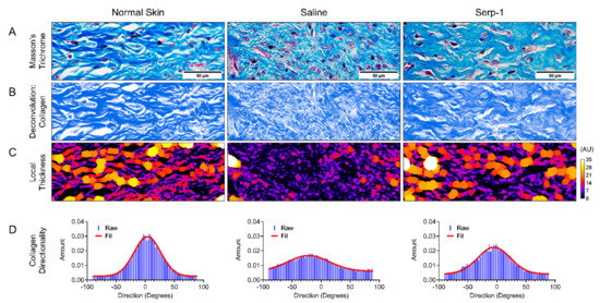 Quantitative collagen texture analysis. (A) Representative 20× images of normal (left), saline treated (middle), and Serp-1 treated (right) skin stained with Masson’s trichrome. (B) Deconvolution of the blue-stained connective tissue component of the trichrome staining. (C) Local thickness analysis with heat-mapped visualization (more purple/black = less thick; more yellow/white = more thick). (D) Raw (blue) and fit (red) data of directionality of the collagen component of the trichrome stain. Greater peaks in the data indicate more preference for a single direction by the component of the image, while a more flat distribution indicates less directionality or preference for a single direction.