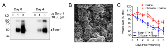 The procedure for preparing the chitosan-collagen hydrogel was adapted from a previously published method [53]. Low molecular weight chitosan was swollen by adding 10 mg chitosan to 10 mL of deionized water and rotating overnight at 4 °C. The excess water was removed from the mixture by centrifugation at 1000× g for 15 min and the swollen chitosan product (as a partial suspension) was frozen at −20 °C for 8 hours followed by incubation overnight at 4 °C. Serp-1 (30 µg in 16 µL) was added and the mixture was rotated at 4 °C for 8 hours and then lyophilized overnight. Shortly (less than 1 hour) before treatment or in vitro assays, the lyophilized product was added to Type I collagen solution (Sigma Aldrich Life Science, St. Louis, MO, USA, C3867) to a total volume of 300 µL to form a chitosan-collagen/Serp-1 hydrogel at a concentration of 1.0 µg Serp-1 per 10 µL gel. Chitosan-collagen hydrogel without Serp-1 (saline only) was used as a control. The final product had well-characterized biodegradation in the skin and other tissues [62].