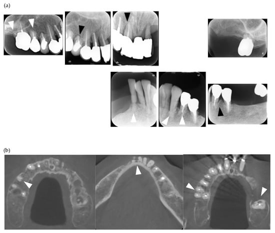 - Matsuda, S.; Memida, T.; Mizuno, N.; Ogawa, I.; Ouhara, K.; Kajiya, M.; Fujita, T.; Sugiyama, E.; Kurihara, H. Reparative bone-like tissue formation in the tooth of a systemic sclerosis patient. Int. Endod. J. 2018, 51, 1059–1066. [Google Scholar] [CrossRef] [PubMed]