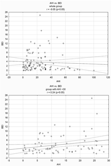 Correlation scatter plots between apnea–hypopnea index (AHI) and bruxism episode index (BEI) in the whole group, in the group with AHI < 30 and in the group with AHI ≥ 30.