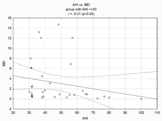 Subsequently, to determine the factors that were independently associated with BEI in the studied patients, a regression analysis was made. In the group with AHI < 30, using a multivariate regression analysis and considering all potentially independent variables that were statistically significant in univariate models (male gender, age, diabetes, coronary artery diseases, AHI and arousal index), model 1 was obtained. Then, stepwise (in each step by removing the variable with the highest p value from the model), models 2–4 were obtained (Table 4). The highest determination coefficient R2 (0.488) was shown for model 1: BEI = 0.92 + 0.12 AHI + 1.73 male gender + 1.59 diabetes ± 3.82. On the basis of the obtained model, it can be stated that higher AHI, male gender, and diabetes were independent predictors for increased BEI in the studied patients.