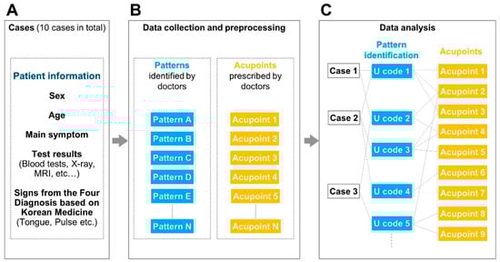 Using a virtual diagnosis approach, 800 medical records were collected that allowed diagnosis patterns to be identified according to Korean Medicine theory, and thus the prescription of combinations of three to five acupoints (Figure 1B). Eighty data points per case were collected for analysis in text format. Because the data were in a free-text format, without any restriction on the terminology used, the pre-processing step included unification of the diverse terminology. Pre-processing was performed using International Statistical Classification of Diseases and Related Health Problems (ICD)-10 codes, specifically U codes (U20–U99), or specialised codes specific to Korean medicine []. The ICD-10 codes were used because together they constitute a disease classification system incompatible with Korean medicine, thus unifying Western and traditional Korean approaches. The U codes in ICD-10 were developed to capture patterns and symptoms diagnosed only using Korean medicine. Patterns identified by the doctors in this study were matched to the most appropriate U codes. When the doctors described individual symptoms rather than the overall diagnosis pattern, an R code within ICD-10 was applied. Two senior medical students of the College of Korean Medicine provided the first-draft matching process. Finally, a Korean medical doctor with five years of training reviewed all of the diagnosis pattern U code matches. Disagreements between the researchers were discussed until a final decision was arrived upon.