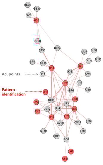 Network analysis of diagnosis patterns and prescribed acupoints. A diagnosis pattern -acupoint network was generated featuring nodes (acupoints) and edges (pairs of correlated acupoints). R42 (vertigo), U30 (diseases of the musculoskeletal system and connective tissue), U60 (qi deficiency), U61 (blood disorder), U62 (qi-blood-yin-yang deficiency), U63 (pattern of fluid and humour), U65 (liver excess), U66 (heart deficiency), U67 (heart excess pattern), U68 (spleen disease), U71 (kidney disease), and U73 (stomach disease) were included. Red and grey nodes represent diseases and acupoints, respectively. Nodes with higher eigenvector centrality are located in the centre of the network. The thickness of the edge is proportional to the frequency of correlations between linked nodes.