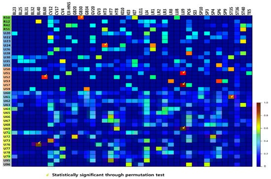 The permutation test showed that the tf-idf values of acupoint BL40 for bladder disease (U76); BL60 for greater yang heat (U52); GB30 for pelvic pain (R10); HT3 for numbness and insensitivity (U24); LU9 for yang disease (U51), yin disease (U57), and lung disease (U69); and ST35 for blood disorder (U61) reached statistical significance; this indicates that these acupoints are specifically prescribed for these diagnosis patterns.