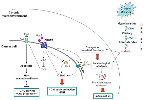 Stress mediates its downstream effects at least through disorganizing the function of the immune system in multiple directions. Experimental evidence has shown that acute stress increases resistance to infection and favors the activation of innate immunity, while chronic stress suppresses the adaptive immunity, thus making the body vulnerable to inflammatory, neoplastic, and autoimmune diseases [10]. Accordingly, excessive physical or psychological stress in humans has been reported to exert short and lasting effects on the function of many peripheral organs, including the lower gastrointestinal (GI) tract [11,12,13,14,15]. Several studies have clearly shown that stress alters intestinal functions such as gut motor and mucosal activity, visceral hypersensitivity, as well as epithelial barrier and local immune functions, via pathways involving peripheral CRH signaling [16]. These alterations have been reported to be involved in the onset and pathophysiology of chronic intestinal disorders, including inflammatory bowel disease (IBD) and irritable bowel syndrome (IBS) [9,15,17]. IBD is considered one of the predisposition factors for developing dysplasia and colorectal cancer (CRC) [18,19,20,21], mainly via modulation of the local immunological profile. A modified immune microenvironment in the colon can induce tumor initiation and progression by accelerating angiogenesis, cell proliferation and tumor cell invasiveness [18].