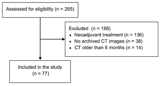 This retrospective observational study was performed on the data of 77 HCC patients after liver transplantations performed in the period between January 2006 and June 2017 in the Department of General, Transplant and Liver Surgery of the Medical University of Warsaw. The sole inclusion criterion was histologically confirmed HCC in the explanted liver. Exclusion criteria comprised a lack of available images from multiphasic computed tomography (CT) performed within 6 months preceding transplantation and utilization of neoadjuvant treatment (Figure 1). The study protocol was approved by the local ethics committee of the Medical University of Warsaw (AKBE/231/2017). Due to the retrospective nature, the need for informed consent was waived.