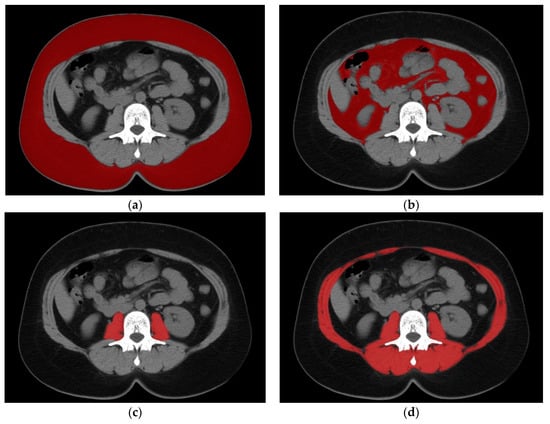 Examples of muscle and adipose tissue measurements: (a) Subcutaneous Fat Area (b) Visceral Fat Area (c) Psoas Major Area (d) Total Skeletal Muscle Area. (a) red zone represents Subcutaneous Fat Area, in this patient it was 332.6 cm2/m2 (b) red zone represents Visceral Fat Area, in this patient it was (138.9 cm2/m2) (c) red zone represents Psoas Major Area, in this patient it was 16.8 cm2/m2 (d) red zone represents Total Skeletal Muscle Area, in this patient it was 123.2 cm2/m2.