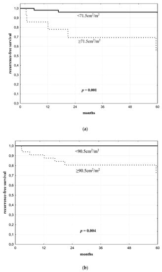 The optimal cut-offs for prediction of post-transplant HCC recurrence were 71.5 cm2/m2 for SFA and 90.5 cm2/m2 for TFA with AUCs of 0.772 and 0.767, respectively. Five-year recurrence-free survival rates were 96.0% in patients with SFA < 71.5 cm2/m2 as compared to 55.4% in patients with SFA ≥71.5 cm2/m2 (p = 0.001; Figure 3a). Five-year recurrence-free survival rates were 100% in patients with TFA <90.5 cm2/m2 as compared to 72.5% in patients with TFA ≥90.5 cm2/m2 (p = 0.004; Figure 3b).