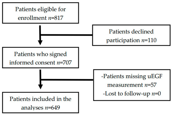 In this prospective cohort study, all adult RTR with a functioning graft for ≥1 year, without history of drug addiction, alcohol addiction or malignancy, who visited the outpatient clinic of the University Medical Center of Groningen (The Netherlands) between November 2008–May 2011 were invited to participate. In total 707 (86%) of the 817 eligible RTR signed a written informed consent. RTR with missing information about uEGF at enrollment (n = 57) were excluded, resulting in 649 RTR eligible for the statistical analyses (Figure 1). There were no significant differences in risk factors for graft failure between patients with complete data and patients with missing data (Table S1). The primary end point of the current study was death-censored graft failure, defined as restart of dialysis or need of re-transplantation. The patients were followed-up for a total of 3 years. We contacted general practitioners or referring nephrologists in cases where the status of a patient was unknown. No participants were lost to follow-up (Figure 1). The current study was approved by the institutional review board (METc 2008/186) and adhered to the Declarations of Helsinki and Istanbul.