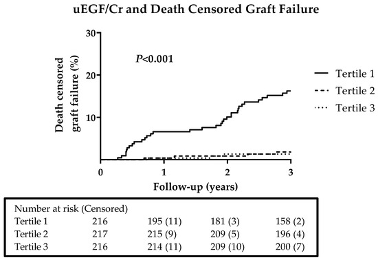 The following are available online at https://www.mdpi.com/2077-0383/8/10/1673/s1, Table S1: Comparison of characteristics between renal transplant recipients with and without data of urinary EGF concentration; Table S2: Glycated hemoglobin according to tertiles of uEGF/Cr ratio in diabetic and non-diabetic subjects; Table S3: Positive and negative predictive value by tertiles of uEGF/Cr; Table S4: Effect-modification of pre-specified characteristics on the associations of uEGF/Cr with graft failure; Table S5: Multivariable-adjusted associations between uEGF/Cr ratio and graft failure in RTR among the −2 and +2 standard deviations of uEGF/Cr.