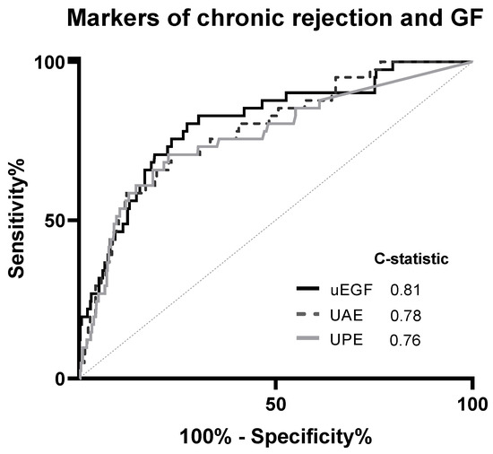 Epidermal growth factor (EGF) is a 53-amino acid peptide produced in the kidney at the ascending loop of Henle and the distal convoluted tubule [7,8]. It stimulates the proliferation and differentiation of epidermal and epithelial cells, and under normal conditions it has a critical role in renal development [7], maintenance of renal tubule integrity and tubular regenerative response to acute kidney injury [9,10,11]. However, the dysregulation and chronic activation of its receptor is known to promote pro-inflammatory response [12]; furthermore, it has been implicated in the development of interstitial fibrosis [13]. In clinical settings, the urinary excretion of EGF has shown to be decreased in a wide range of kidney pathologies—e.g., diabetic nephropathy and IgA nephropathy—suggesting that it could potentially work as a biomarker of a pathway which is common to several kidney tissue insults [14]. Although it would not be possible to summarize the complexity of the graft failure process with one biomarker, fibrosis is an important step towards graft failure development [2]; and suppression of urinary EGF (uEGF) is an early marker of this phenomenon [15]. It may be theorized that uEGF could also be altered in patients at high risk of graft failure; however, the potential association with outcome or predictive ability of uEGF for graft failure is yet to be evaluated.