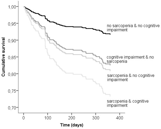 Kaplan–Meier curves showing survival according to the presence of cognitive impairment, sarcopenia or combined sarcopenia and cognitive impairment.