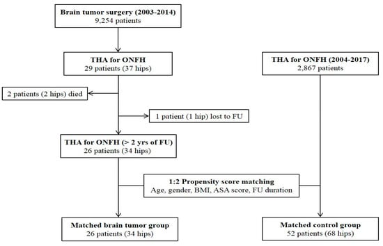 The remaining 26 patients (34 hips) with brain tumors were included in the study population. Among them, 8 patients underwent simultaneous bilateral THA or sequential bilateral THA due to ONFH involved in both hips. All THAs were performed between April 2004 and February 2017. During the same period, a total of 2867 patients underwent primary THA due to ONFH. We set the matched control group among these patients using the 1:2 matching technique. After generation of the propensity score with age, sex, body mass index (BMI), American Society of Anesthesiologists (ASA) score, and follow-up duration, 52 patients (68 hips) were selected as the control group (Figure 1). All surgical outcomes were compared between the two matched groups.