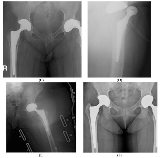 - Broden, C.; Mukka, S.; Muren, O.; Eisler, T.; Boden, H.; Stark, A.; Skoldenberg, O. High risk of early periprosthetic fractures after primary hip arthroplasty in elderly patients using a cemented, tapered, polished stem. Acta Orthop. 2015, 86, 169–174. [Google Scholar] [CrossRef] [PubMed]