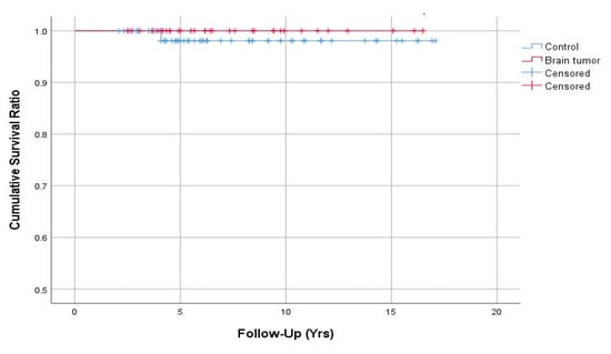 Patients with brain tumors and the control group were matched at a ratio of 1:2 using the propensity score generated by logistic regression. Improvement in the clinical score for each group was determined using paired t tests. Continuous variables were compared between groups using Student’s t tests or Wilcoxon rank-sum tests. Chi-squared or Fisher’s exact tests were utilized to compare differences in the distribution of categorical values between groups. Implant survivorships were estimated by Kaplan–Meier survival analyses with the endpoint of revision for any reason, and intergroup differences were determined using log-rank tests. All statistical analyses were performed using SPSS Statistics, version 25.0 (IBM Corp., Armonk, NY). In all analyses, a P-value of <0.05 was taken to indicate statistical significance.