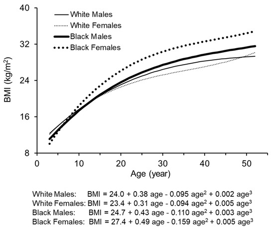 Parameters of nonlinear growth curves of BMI from childhood to adulthood were estimated using a random-effects mixed model by SAS proc MIXED, as previously reported [26,27]. The mixed model incorporates fixed and random effects and allows the intercept, linear and nonlinear parameters to vary from individual to individual. The random effect coefficients represent deviations of BMI for individuals from the fixed-effect parameters. In addition, the mixed model allows for repeated measurements and different numbers of unequally spaced observations across individuals. The model computes maximum-likelihood estimates of growth curve parameters, including fixed-effect parameters (for a group) and random-effect parameters (individual specific). By combining these two types of parameters, 5195 sets of growth curve parameters were generated for each of 5195 participants of the study cohort. The model selection was based on the Akaike’s information criterion (AIC) and p-values of the independent variable (age) at the significance level of 0.05. Age and its higher-order terms were included one by one for model building. The higher-order terms of age were not included in the model if they were not significant, or made lower-order terms not significant, or did not improve the goodness-of-fit of the model based on AIC values. Cubic curves were fitted for BMI in race–sex groups: