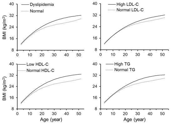 Growth curves of BMI in groups classified by dyslipidemia groups. BMI = body mass index; LDL-C = low-density lipoprotein cholesterol; HDL-C = high-density lipoprotein cholesterol; TG = triglycerides.
