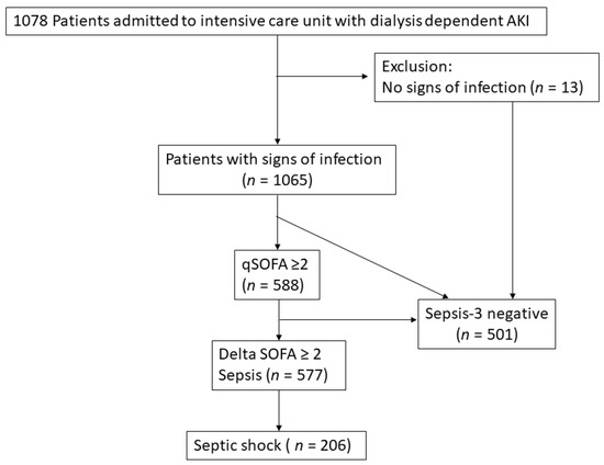 The aims of our project were: (i) To describe the incidence, outcomes, and characteristics of sepsis, as defined by the screening Sepsis-3 criteria, among AKI-D patients; and (ii) to show the outcomes of AKI-D patients without or with sepsis.