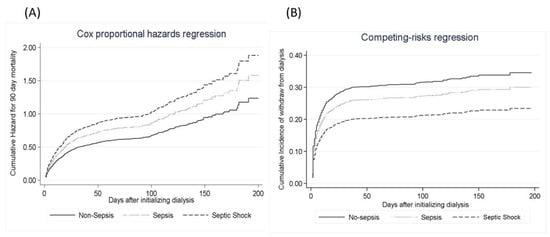 Cox proportional hazards models. (A) Cox proportional hazards models are plotted to model the probability of free from 90 days mortality, stratified by Sepsis-3 status. (B) Model the risk of chronic dialysis, taking mortality as a competing risk.
